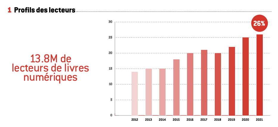 Si 2020 a vu la croissance générale des pratiques télévisuelles et d’internet du fait des confinements, l’augmentation du comportement numérique s’applique également à la lecture. On comptabilise un gain de presque 1 million de lecteurs pour le livre numérique en douze mois : en 2020, plus d’un Français sur quatre (26 %) a ainsi déjà lu un livre numérique.
