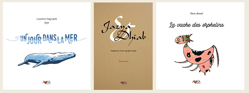 Les deux premières publications, écrites et illustrées par l’autrice algérienne Nora Aceval, paraissent en septembre 2022. Jazya et Dhiab, dans la collection « Voix haute », porte la geste hilalienne* des hauts plateaux algériens comme les fragments d’une épopée ; tandis que La vache des orphelins partage l’une des histoires merveilleuses les plus racontées aux enfants du Maghreb.