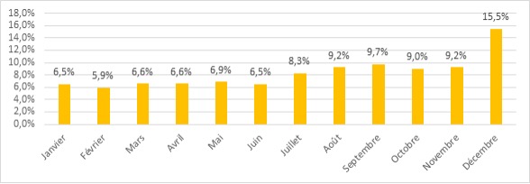 On entend de nombreux chiffres concernant l’importance du mois de novembre en terme de ventes des librairies. Pour mieux appréhender l’impact économique de cette crise sur les librairies indépendantes de la Région, ce graphique représente la répartition de leurs CA mois par mois, autrement appelé “saisonnalité des ventes”.