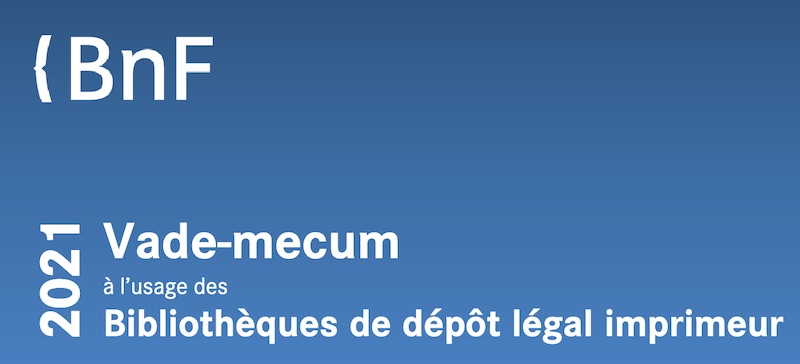 La Bibliothèque nationale de France fait paraître un Vade-mecum à l’usage des bibliothèques de dépôt légal imprimeur (2021), issu d’un travail collaboratif avec quatre de ces bibliothèques (Angers, Lyon, Marseille et Nancy).