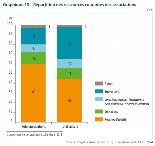 Bien qu’étant diversifiés, les apports financiers de ces organisations sont limités. Ils représentent 7,2 milliards d’euros contre 124,6 milliards pour la totalité. Leur budget est constitué en partie pour 45 % de recettes d’activité et 33 % de subventions. Le reste comprend les cotisations et les dons, legs, mécénat, fondation etc. pour respectivement 10 et 11 % ; chiffres sensiblement identiques pour l’ensemble du secteur associatif. La structure de leur financement ne doit cependant pas cacher que seul un tiers des structures culturelles sont subventionnées avec une différence notable entre les structures avec ou sans salariés : respectivement 57 % et 28 % bénéficient d’aides publiques. Le soutien provient pour les deux tiers des collectivités territoriales. 28 % pour les Communes ou les Intercommunalités, 9 % pour les Départements, 4 % pour les Régions et 4 % pour l’État.