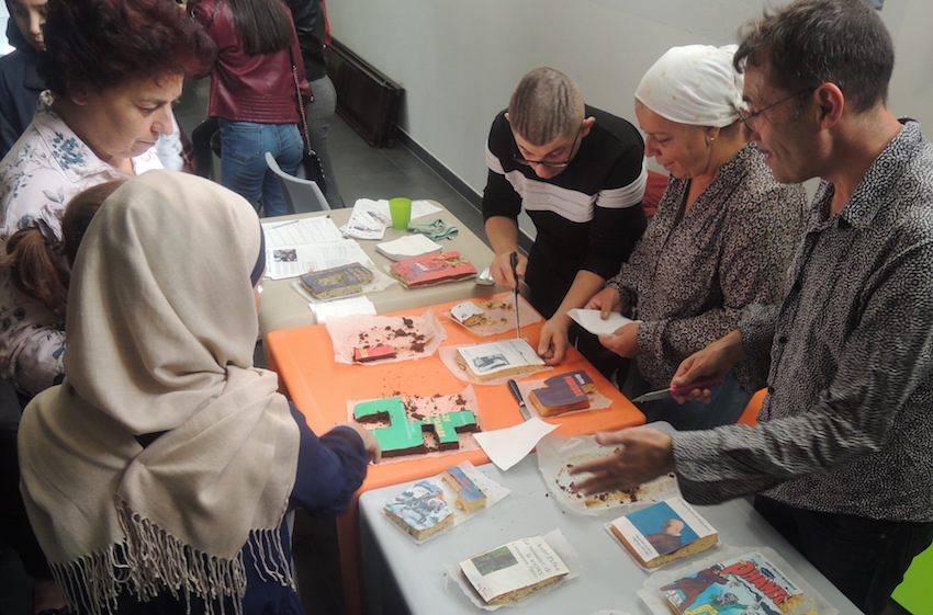 Parmi ce foisonnement de projets : Lire et manger le livre,une performance gustative. Partant de l’envie de démystifier les livres par l’oralité, la compagnie propose une lecture culinaire pour tous âges et tout public. Des “livres mangeables” dont chacun pourra choisir exactement le morceau de couverture qu’il souhaite déguster. En amont de la dégustation, tout un rituel : une semaine à dix jours avant, les habitants/participants/volontaires sont sondés : « quels livres voudriez-vous lire et manger ? ». Parfois ce sont des thématiques qui orientent les choix, parfois seulement des coups de coeur. Les couvertures des ouvrages retenus sont imprimés avec des fibres alimentaires sur une page de sucre qui va venir recouvrir le gâteau (dont la recette a également été choisie par les participants). Le cérémonial peut alors commencer : l’un des membres de la compagnie lit un extrait du livre avant que la couverture ne soit découpée en parts. Le gourmet choisit son morceau de couverture et le mange…