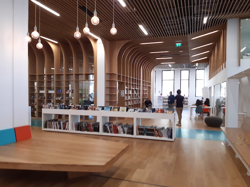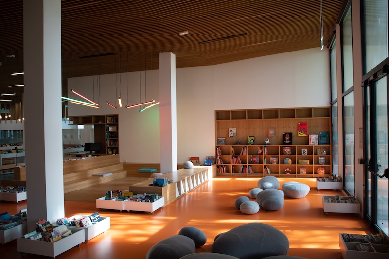 La médiathèque offre aux habitants du quartier un espace de 981 m2 accueillant, lumineux et confortable. Les aménagements intérieurs ont été réalisés par l’atelier Mira. Dans l’ensemble du bâtiment, le bois est très présent, de grandes baies vitrées et un éclairage soigné viennent souligner la qualité des matériaux et l’attention portée à la décoration. Les architectes ont réussi à mener une vraie réflexion sur l’esthétique du lieu et sa fonctionnalité. Un banc amovible par exemple permet de fermer l’espace des collections pour certaines occasions. L’arbre de l’ancienne cour d’école a été conservé comme une trace de l’histoire du lieu. On sent déjà que l’usager s’approprie le lieu malgré les contraintes sanitaires : des lecteurs sont installés dans différents espaces. L’ambiance est familiale.