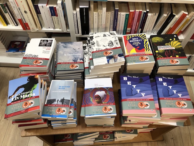 Neuf titres ceints d’un bandeau “Prix PTGRL / 3e édition”, en piles bien visibles dans la librairie, accompagnés de bulletins de vote et marque-pages.