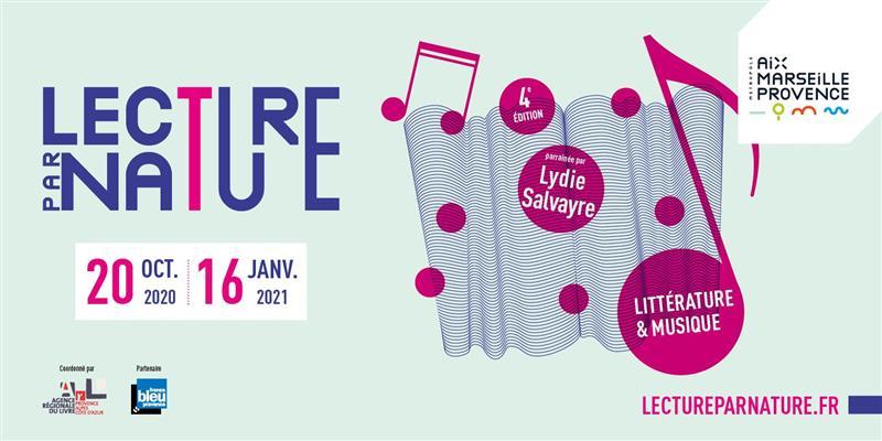 Du 20 octobre 2020 au 16 janvier 2021, Lecture par Nature fait résonner le lien entre littérature et musique, écrit et son, sur tout le territoire de la Métropole Aix-Marseille Provence, sous l’égide de Lydie Salvayre, marraine de cette 4e édition. 91 événements sont proposés, entièrement gratuits et ouverts à tous sur réservation.
