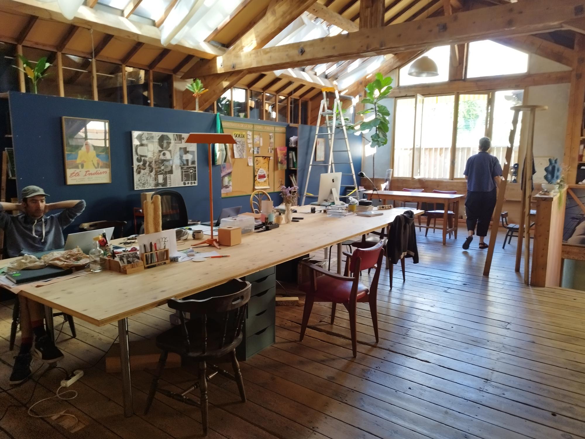 Lisa Laubreaux, illustratrice ; Fanny Molins, réalisatrice et scénariste ; Sara Oliviero, architecte ; Poulet bicyclette, graphiste ; Anaïs Sautier, autrice de roman et la compagnie des arts de la rue Superfluu occupent l’atelier. Les menuisiers, Carles et Demarquet, se trouvent, quant à eux, dans l’immense espace technique au rez-de-chaussée. Une riche cohabitation quotidienne pour l’ensemble des locataires, source de nouvelles inspirations.