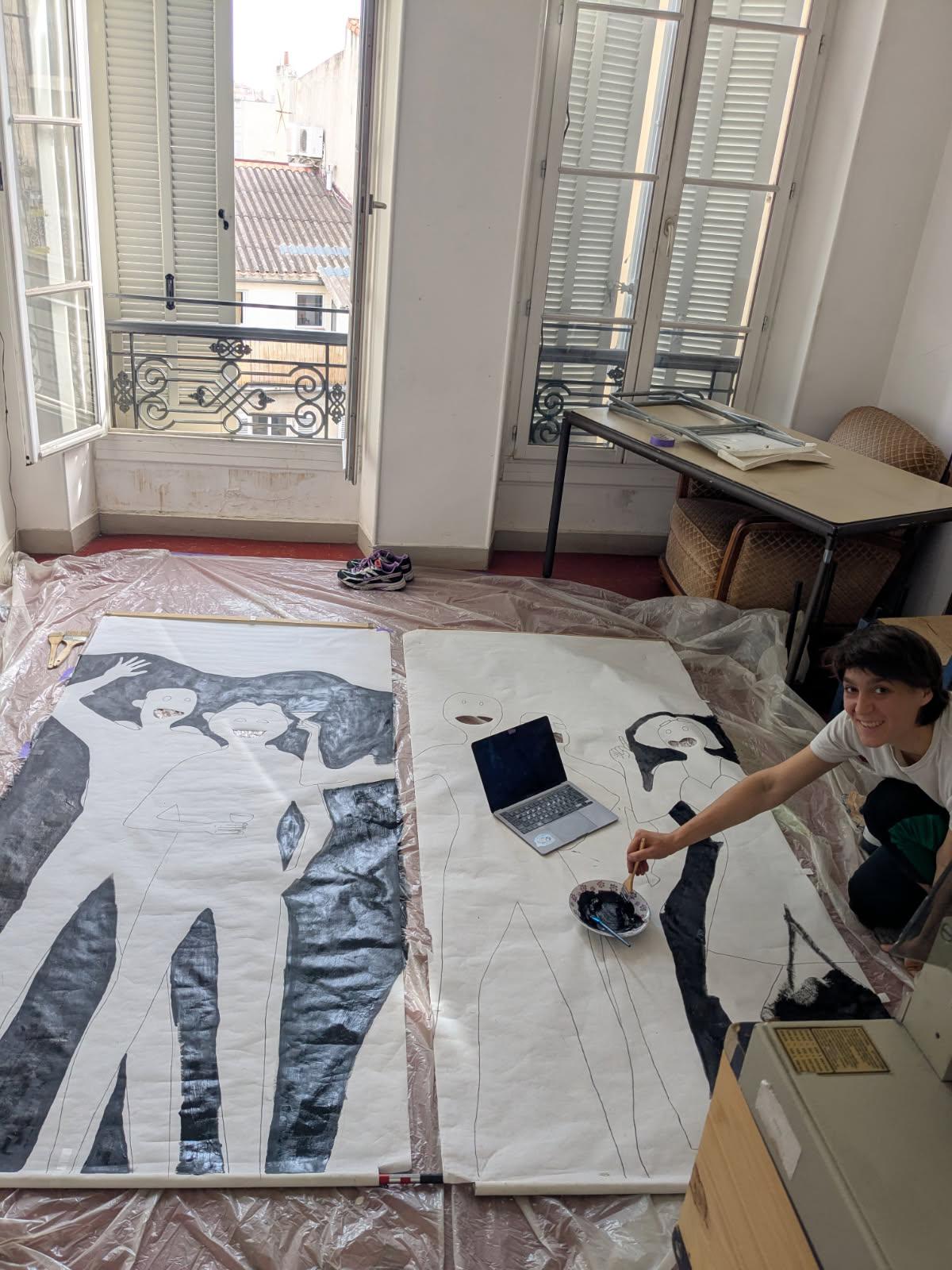 « Des filles, des garçons, du son, du silence, de la peinture, de la bande-dessinée, de la sculpture, des papiers découpés, des morceaux de scotch, de l’encre de chine, des linogravures, des boites d’œufs, des buveurs de café, des buveurs de thé, des cyclistes, des fuites d’eau parfois, dans un grand atelier à Marseille ».