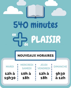 Par ailleurs, la médiathèque a fait l’objet d’une extension de ses horaires d’ouverture : pour l’ensemble du réseau (médiathèque du centre-ville et annexe), 38 heures d’ouverture hebdomadaires, deux journées sans interruption de 10h à 18h (mercredi et samedi), une fermeture à 19h30 le mardi… et une ouverture le dimanche matin pour la bibliothèque centrale !