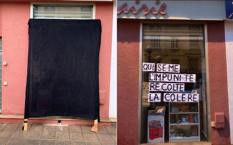 Les vitrines de la librairie Les Parleuses, qui exposaient le livre d’Hélène Devynck, Impunité, ont été bâchées de noir et les clients interdits d’entrée.