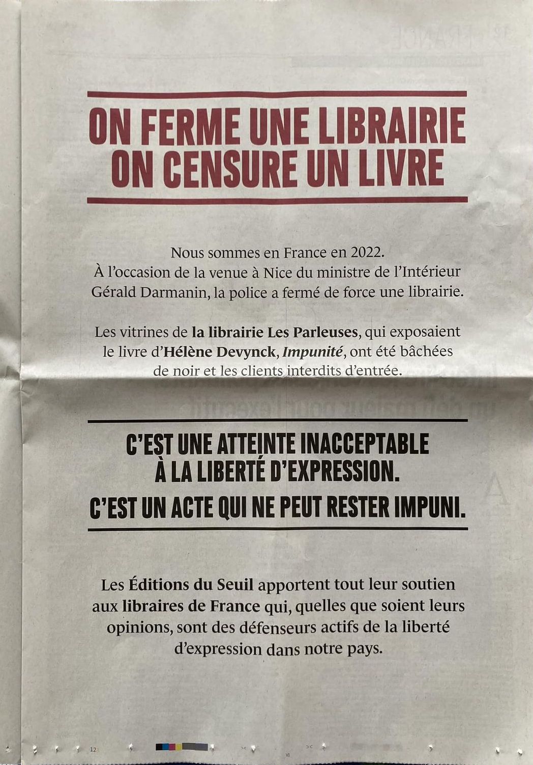 Nous sommes en France en 2022. À l’occasion de la venue à Nice du ministre de l’Intérieur, Gérald Darmanin, la police a fermé de force une librairie.
