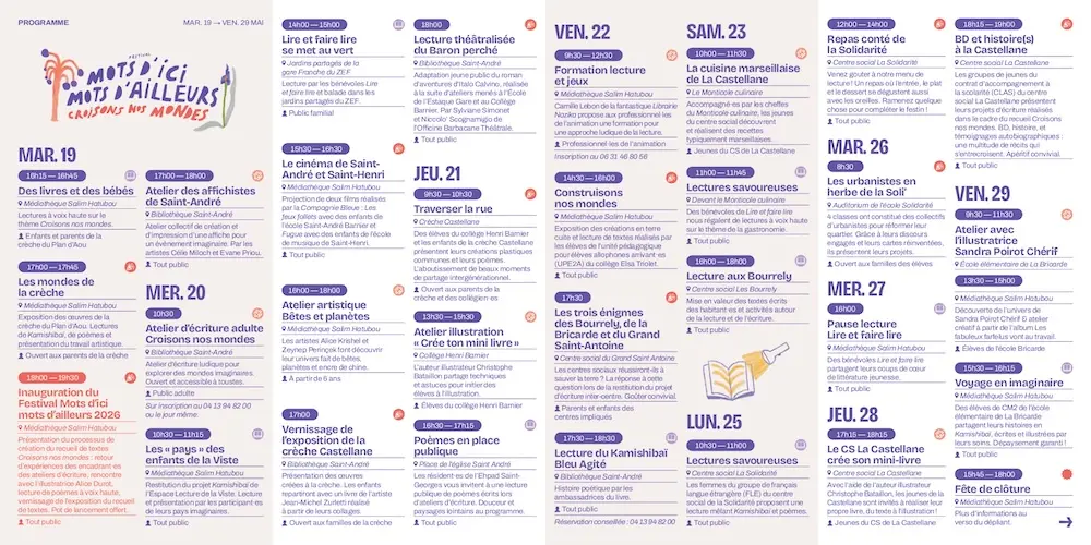 Ce festival célèbre la culture de la lecture, de l’écriture et de l’oralité chez les jeunes et les adultes, dans le cadre de la dynamique lecture du territoire de la Cité éducative Marseille Nord Littoral.