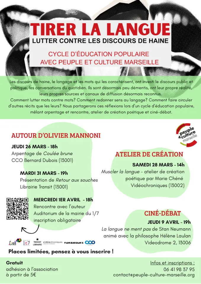 Comment lutter mots contre mots? Comment redonner sens au langage? Comment faire circuler d’autres récits que les leurs? Nous partagerons ces réflexions lors d’un cycle d’éducation populaire, mêlant arpentage et rencontre, atelier de création poétique et ciné-débat.