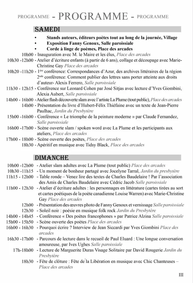 A 14h Patrice Alzina sublimera les poètes francophones, et à 16h30 Yves Ughes conversera avec Paul Eluard…