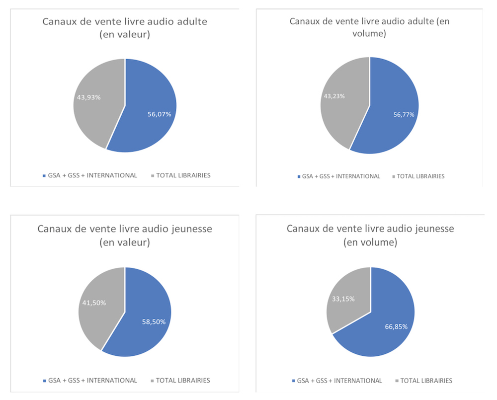 Les livres audio au format physique sont commercialisés dans les librairies, les grandes surface spécialisées culturelles (GSS) et les grandes surfaces alimentaires (GSA), avec une distinction à opérer entre livre audio jeunesse et livre audio adulte. Selon le panel GfK de 2018, les ventes de livres audio par canaux et par segments éditoriaux se répartissent comme suit :