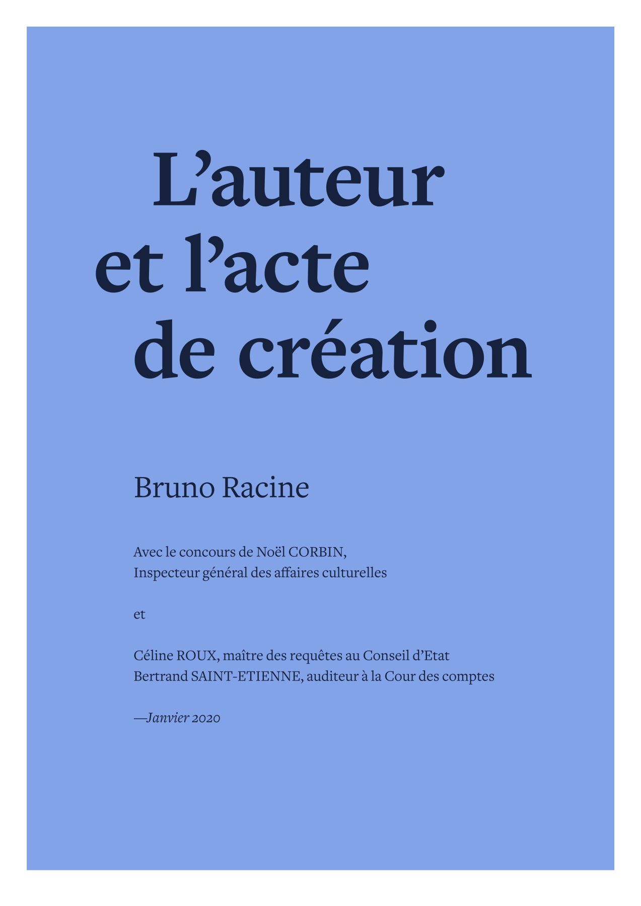 Mission prospective sur la situation des artistes-auteurs confiée par le ministre de la Culture à Bruno Racine. Réalisée avec le concours de Noël Corbin, inspecteur général des affaires culturelles, la mission relève la précarisation de la profession, des difficultés de négociation avec les pouvoirs publics en raison d’un morcellement des structures représentatives et souligne la complexité des politiques publiques de soutien à la création “rarement centrées” sur l’auteur. Elle formule 23 recommandations axées sur le renforcement collectif et individuel des artistes-auteurs.